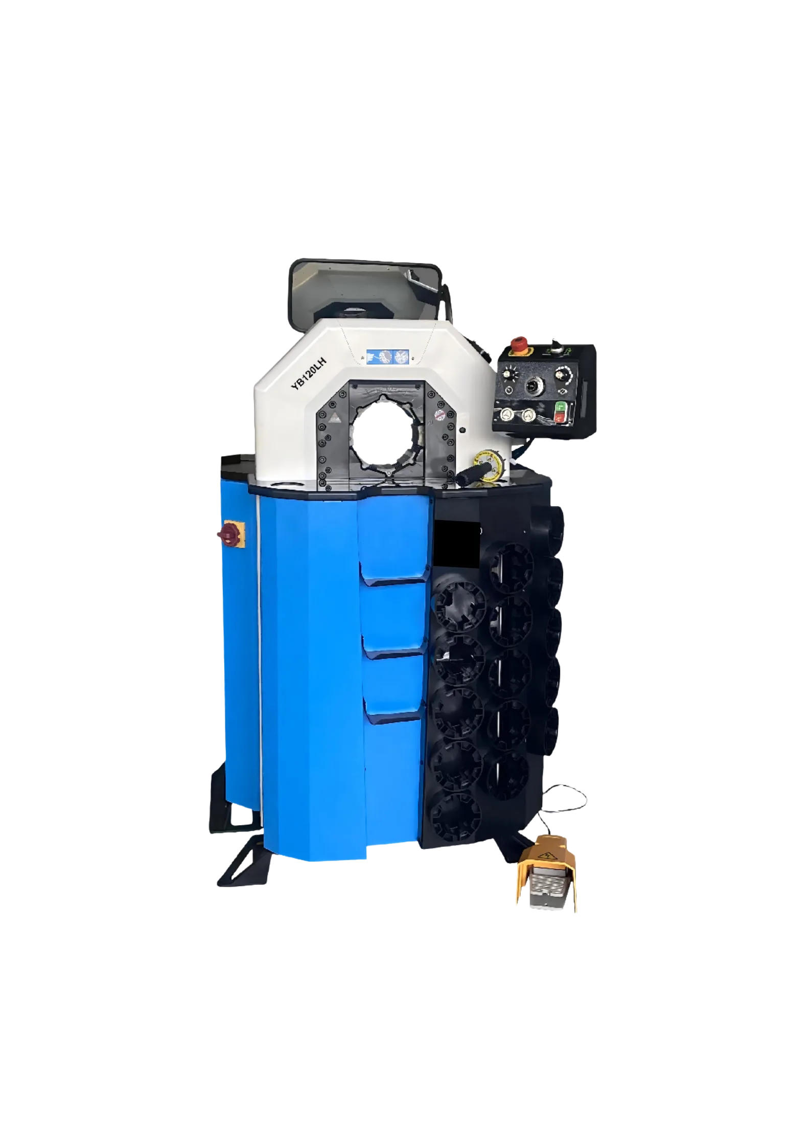 Two die series — P20 (standard workshop dies) and YB120L (extended large bore dies) — cover 10–115mm in one machine. The QuickChange-tool system makes die transitions fast during production runs on this heavy duty hydraulic crimper.