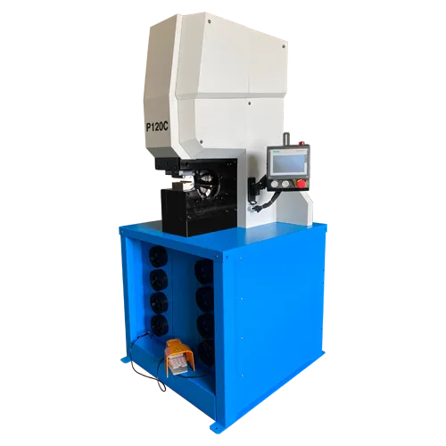 This hydraulic crimper uses 13 standard P20 dies (10–67mm) covering the full workshop hose size range. At 320kg with a 680×500×1300mm footprint, the P120C is a fixed workshop machine built for day-in, day-out industrial production.